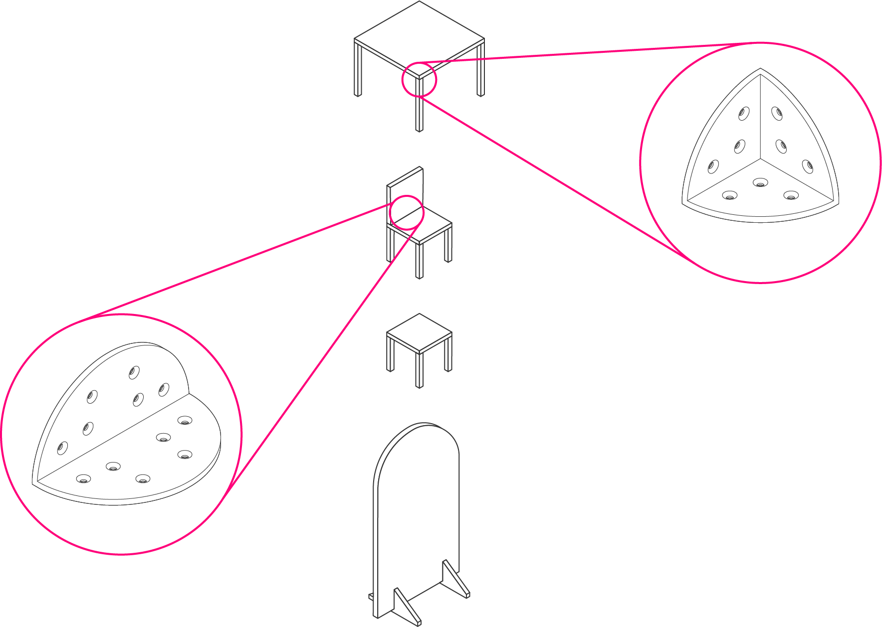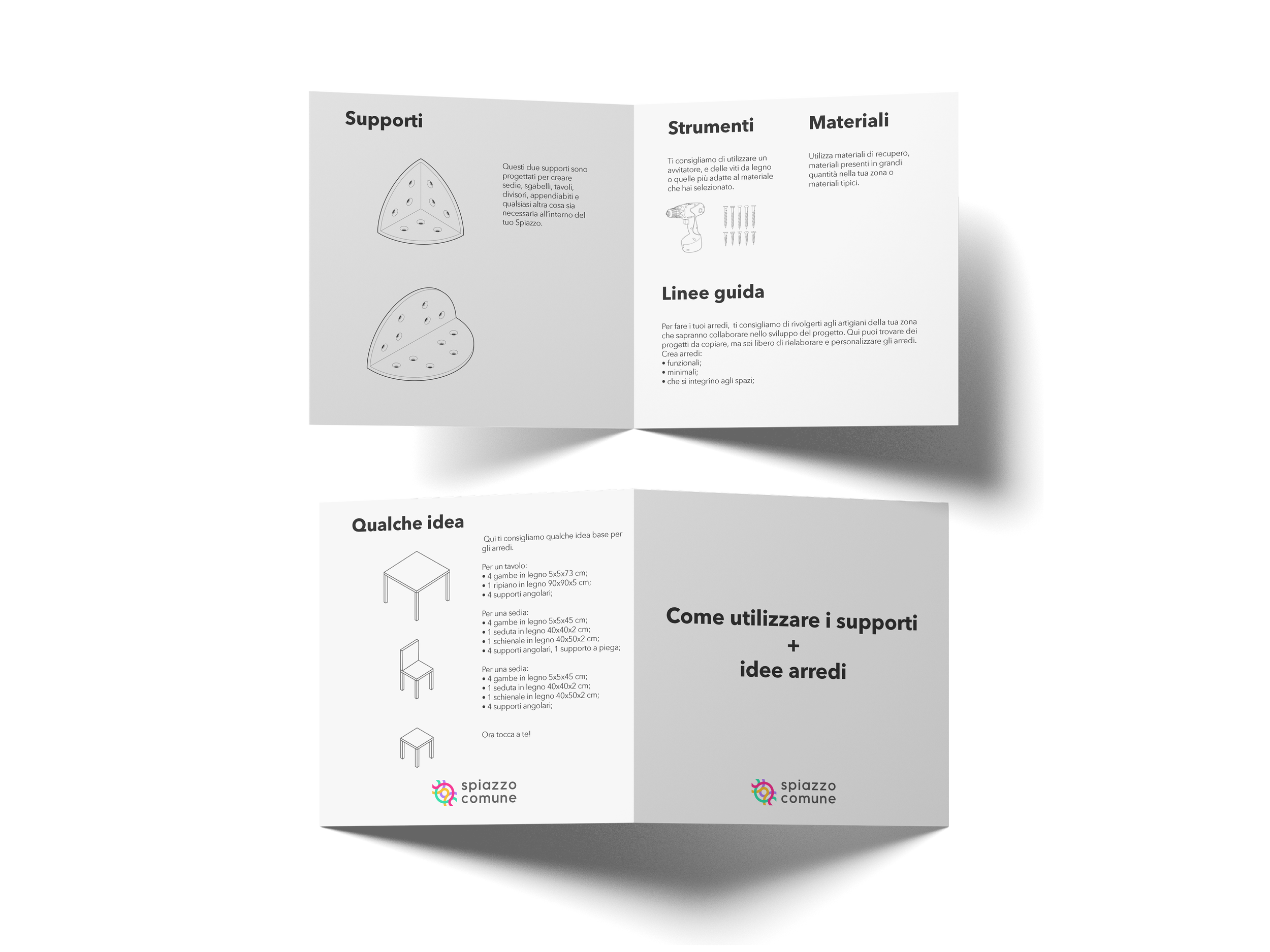 Each Spiazzo receives a kit to make their own customizable furniture . The kid includes steel brackets and an instruction booklet. Each Spiazzo is encouraged to make its own furniture, leveraging the skills of local artisans and using local materials, thereby reducing costs and emissions..