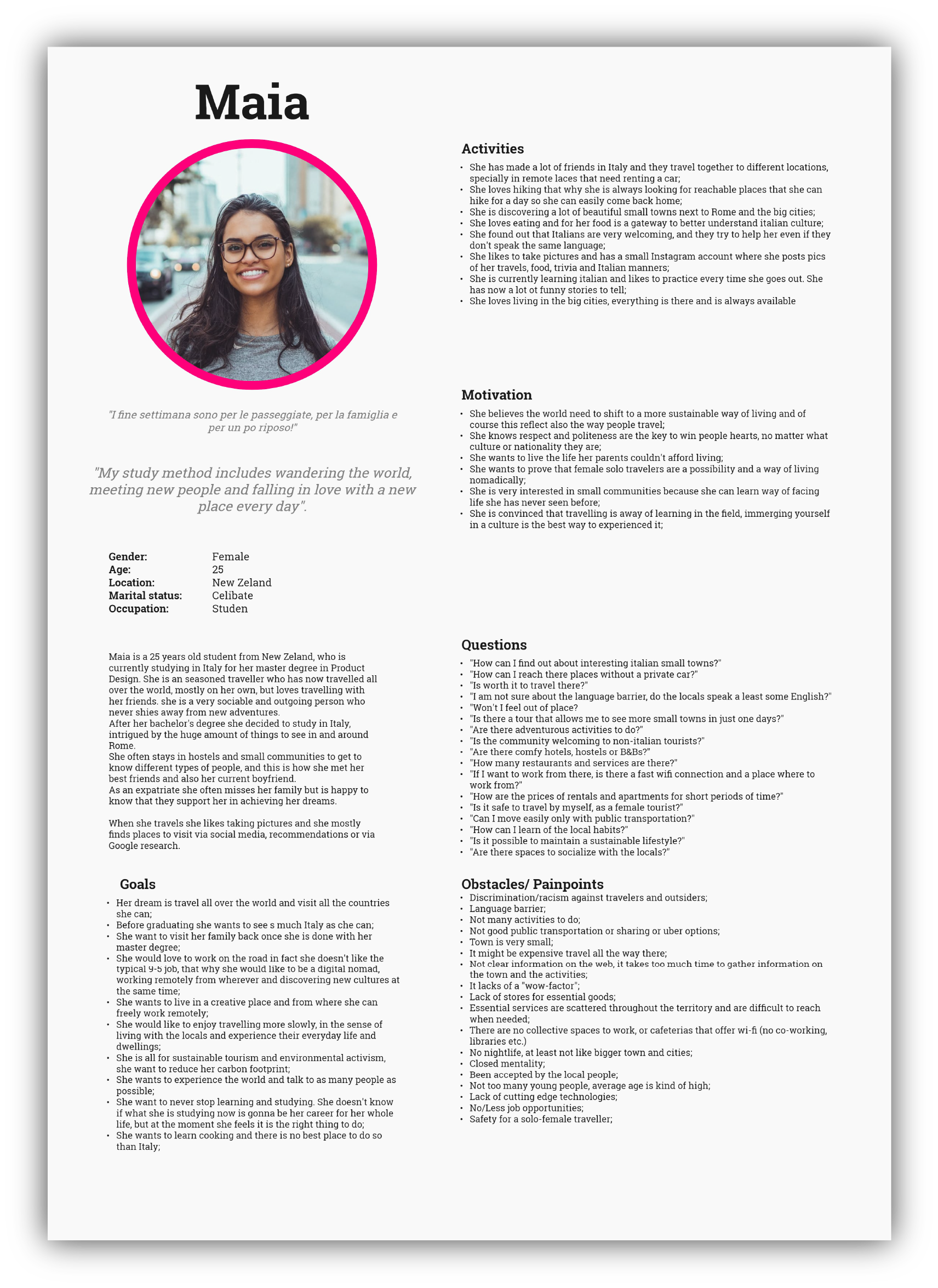 All the data collected in the Empathy Maps have been used to define the Personas. In this case, the breakdown of the maps led to the definition of four personas. In fact from the Inhabitant map, emerged different needs between people of different age groups.