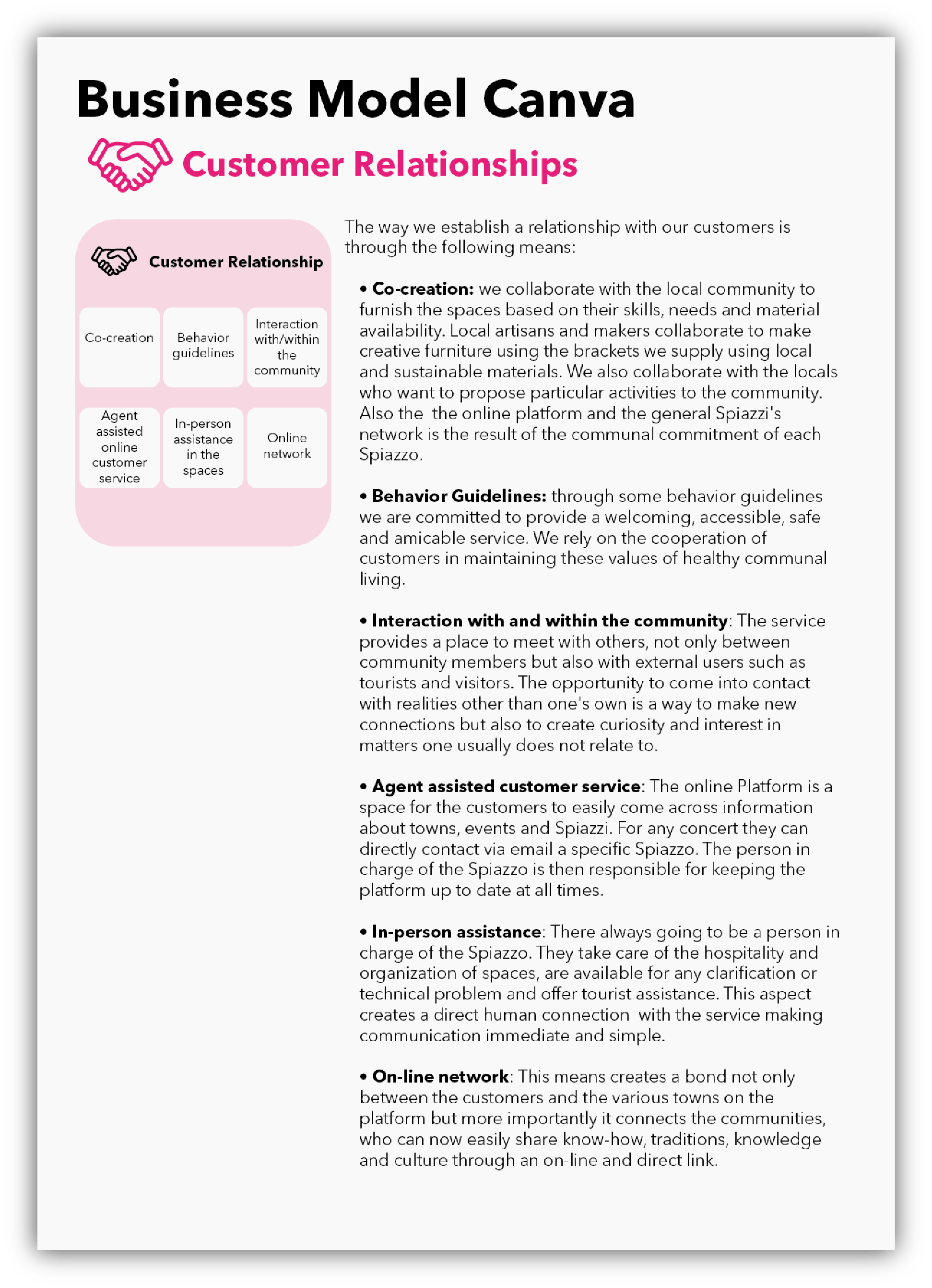 The diagram is intended to be an immediate representation of the service that is expanded in the annex that explains in detail all aspects named in the BMC.