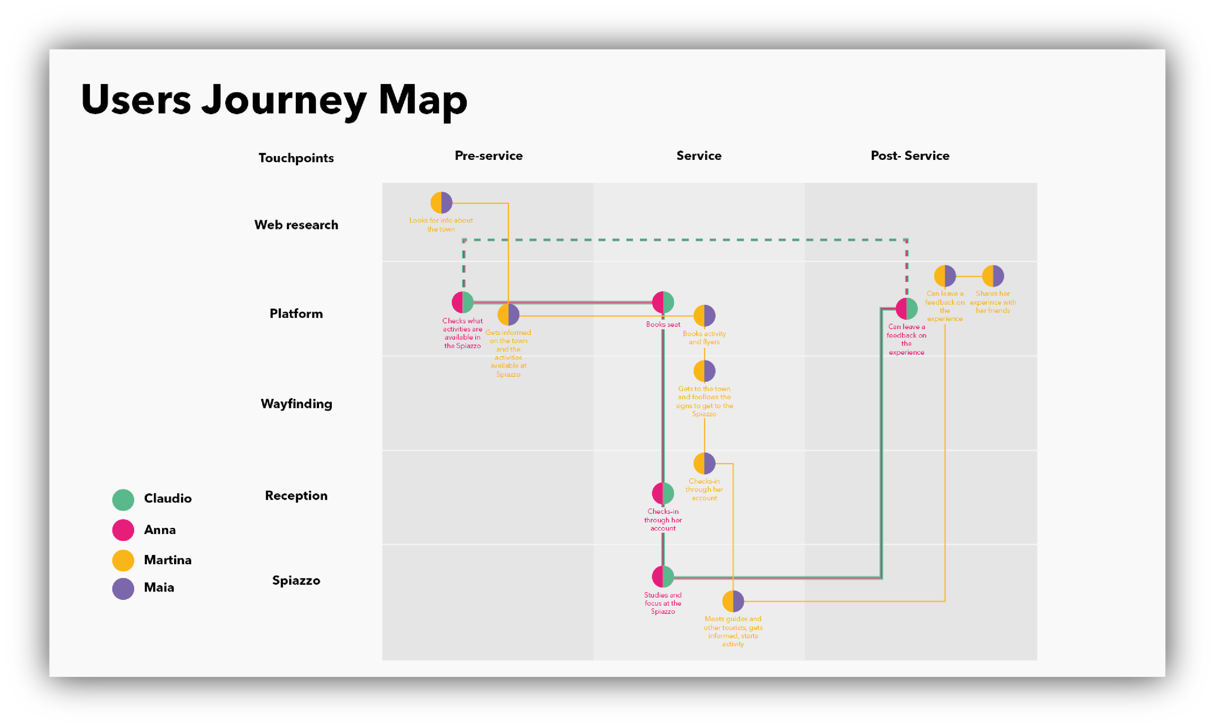 Once the service was comprehensively defined, it was possible to continue the drafting of the User Journey Map. The map allows visualizing the path each type of users take in using the service at every specific touchpoint.